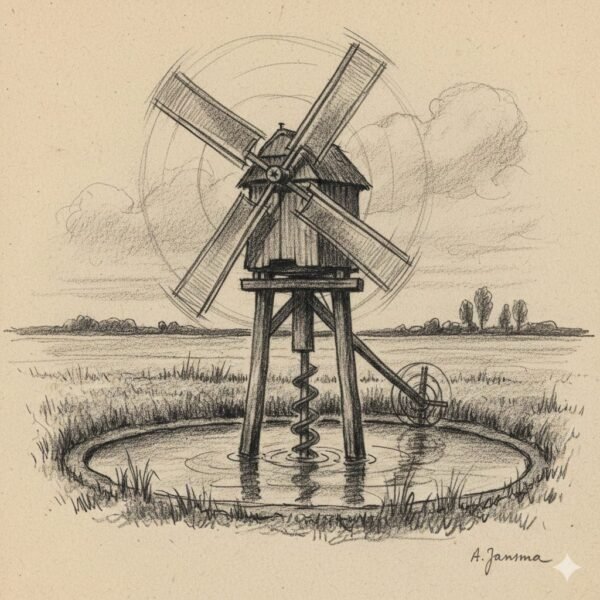 De geschiedenis van de watergangen in de Madesteinsepolder (onderdeel van het recreatiegebied Madestein in Den Haag) is daarom een boeiend samenspel tussen eeuwenoud polderbeheer en moderne landschapsarchitectuur. De monnikstjaskers die je daar ziet, zijn niet alleen decoratief; ze vertellen het verhaal van hoe Nederlanders al sinds de middeleeuwen vechten tegen (en mét) het water. De oorsprong: De Madesteinsepolder, maar dan als buitendijks kweldergebied. Buitendijks: de geprojecteerde zeewerende dijk van Schieland lag veel meer oostelijk van Den Haag. Men vond dat dat dorp niet beschermd hoefde te worden door dat zeeweringsstelsel omdat het op compactere duinen lag dan de rest van Holland. Terwijl Madestein best ook wel zo nu en dan mocht onderlopen, want daar woonden maar armelijke stakkers die geen droge voeten geborgd hoefden te krijgen vanwege de graaf van Holland. Ze betaalden nauwelijks belasting en te fiscaliseren was er niets. Voordat Madestein een recreatiegebied werd, was het een agrarisch polderlandschap. De polder maakte deel uit van het Hoogheemraadschap van DelflandVeenontginning: Oorspronkelijk bestond dit gebied uit veen. Om het land geschikt te maken voor landbouw en veeteelt, moesten er sloten en vaarten (watergangen) worden gegraven om het water af te voeren naar grotere boezems.Inklinking: Door die ontwatering klinkt het veen in, waardoor de bodem daalt. Hierdoor werd de inzet van molens noodzakelijk om het water letterlijk “omhoog” te malen naar de vliet. De rol van de Monnikstjasker is fundamenteel voor het polderstelsel dat zich na 1420 gaat ontvouwen. De tjasker is een van de kleinste types windmolen in Nederland. In de Madesteinsepolder hebben ze een specifieke historische en educatieve functie: Eenvoudig maar doeltreffend: In tegenstelling tot grote poldermolens, is een tjasker mobieler en simpeler. Hij bestaat uit een as met wieken die direct een vijzel (de schroef van Archimedes) aandrijft. De “Monniks”-benaming: De term verwijst vaak naar de sobere, eenvoudige bouwstijl die doet denken aan de houten poldermolens die vroeger door kloosterordes werden gebruikt voor kleinschalige bemaling.