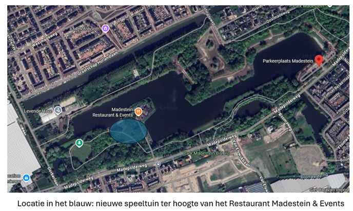 Locatie: de nieuwe speeltuin ter hoogte van Restaurant Madestein (Madepolderweg 100, zie ook de kaart hieronder).