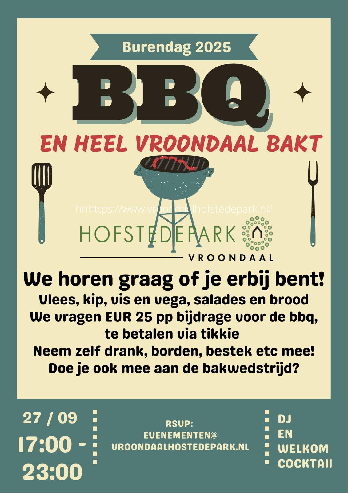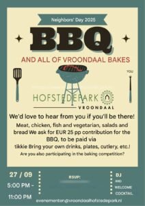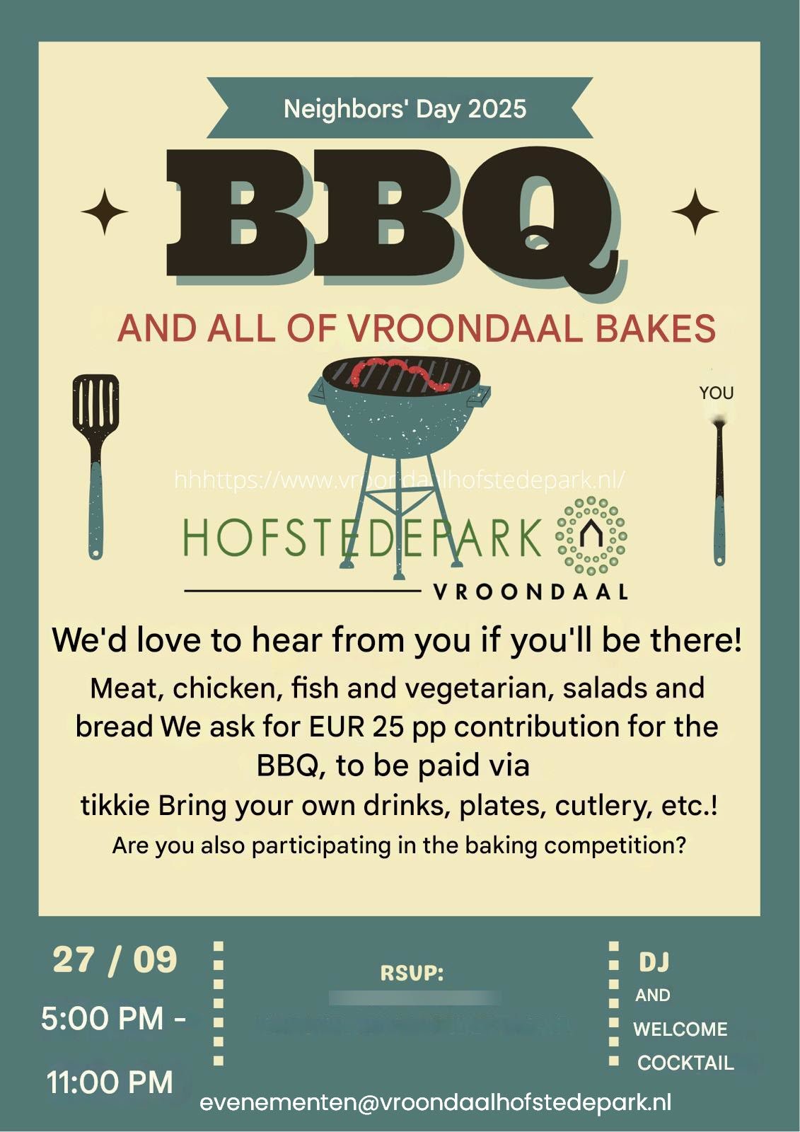 Wijk-BBQ Aansluitend is er een gezellige BBQ voor alle bewoners van Vroondaal. De BBQ vindt plaats bij de speeltuin aan de Nederhoflaan. De feesttent staat al klaar, dus het gaat sowieso door!