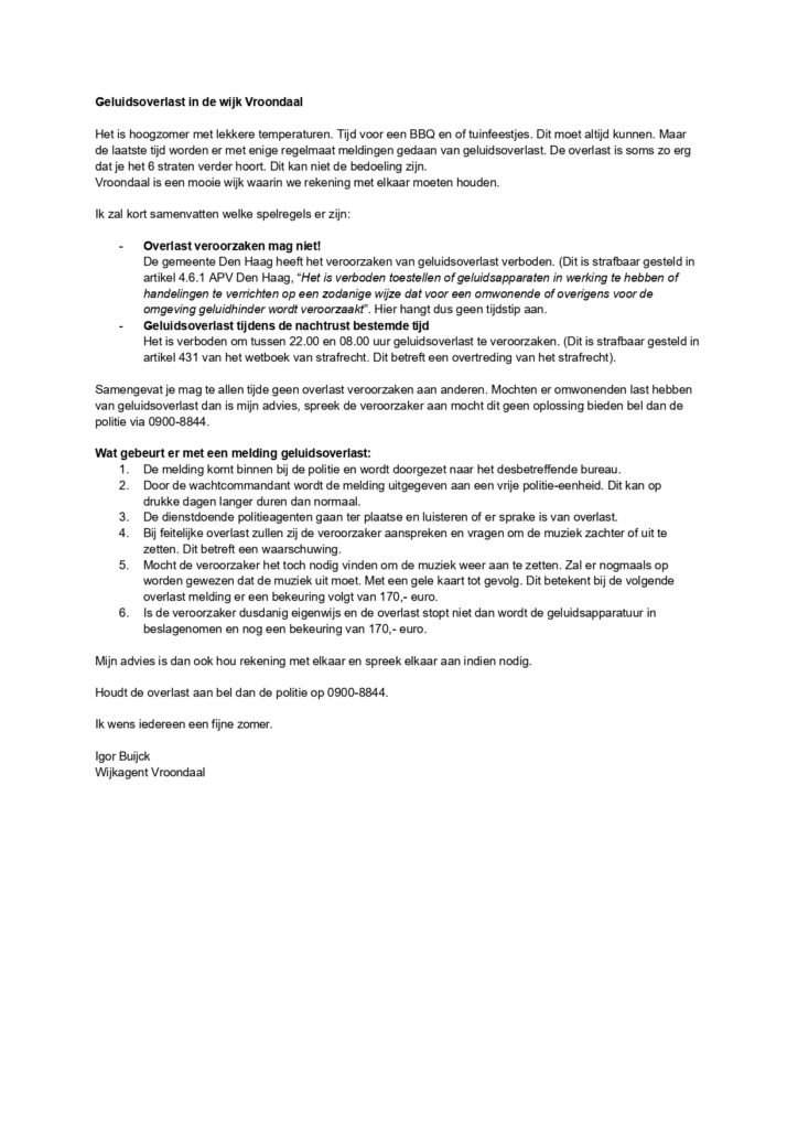 Gelukkig heeft wijkgent Igor Buijck nu besloten een officiële publicatie/waarschuwing te doen uitgaan. We hopen dat het nu gaat doordringen tot diegenen die de overlast veroorzaken.